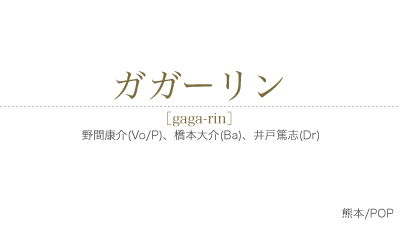 2001年に火の国・熊本にて結成。野間康介(ボーカル&ピアノ)橋本大介(ベース&コーラス)井戸篤志(ドラム)からなるピアノ3ピースバンド。 人類初の宇宙飛行士、ユーリ・ガガーリンに憧れ命名。鍵盤系独自のPOPセンス、一度聞いたら忘れられない特徴的な声、どこか懐かしい風景を思いださせるメロディーが各地でじわじわ話題となる。 インディーズでリリースされた「さよならフリーダム」(03年7月)、「めばえ」(04年3月)の2作品が地元FMでの大量オンエアの後押しを受け、熊本でのレコ発イベントも300人以上を動員する大好評。全国でも年20数ヶ所のツアーを精力的にこなしながら地道にCDの売上げを伸ばし、「九州にガガーリンあり!」といわれる存在に! 2005年4月21日、ついに初のフルアルバム「銀河クラシックス」をBabeStar Labelよりリリース!絶滅危惧ジャンル男性ピアノ弾き語りシーンに一石を投じるガガーリン!! 2006年1月31日をもって解散。 |