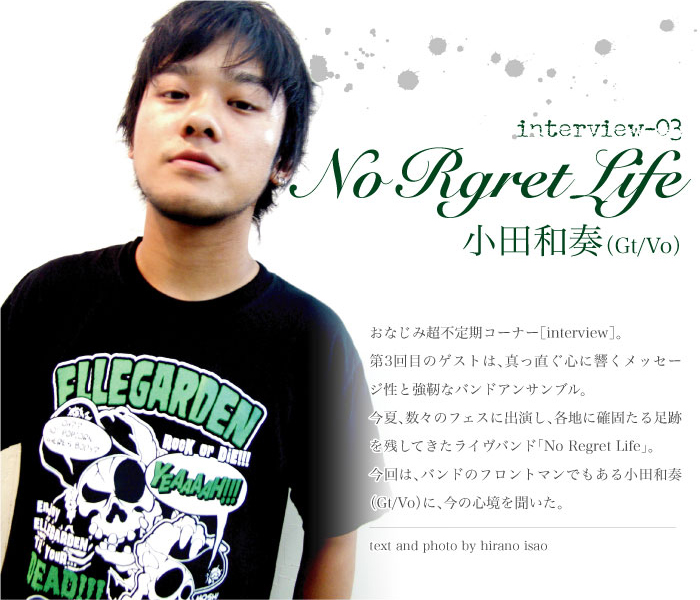 | 7月リリースのシングル「憧れの果て」が1枚アルバムをだした後の一発目のシングルというところに、自分の中でなにか変化はあったりは? そうですね、やっぱりアルバム後って難しいというか、余計なことを考えるタイプの人間なんですよ、僕は(笑)。やっぱりそこでちょっとプラスαというか、アルバムのレコ発ツアーで培ったものを次の音に出さないとダメなんだろうなあというところから始まって、じゃあツアーの曲を書こうと。ツアーで見たもの、感じたこと、それをなんかひとつ書こうかなあというのがあって、プレッシャーっていうか、ちょっとずつその新しいエッセンスを入れていかなきゃっていうのをすごく意識しましたね。よりシンプルにしてみようというか、余分なところを全部取っていこうっていうのは結構あって。 ブログ読んだんだけど、8/25にツアーファイナルワンマン(@下北沢SHELTER)まで「微熱」をとっていたっていうことを書いていたんだけど、それはなにか思い入れみたいなものがあってのこと? そうですね、言ってみれば「憧れの果て」っていうタイトルの3曲入りのシングルじゃないですか。で、「憧れの果て」は"ツアーに行ってまたツアーに行こう"っていうか、ツアーで「ありがとう、また来ます」っていうのを口約束じゃなくてちゃんと達成しようというか、やっぱりバンドって何ができるかと言ったら、曲を書く、歌を歌う、で、ライヴをする。それにもっと良いライヴをするとか、もっと良い曲を書くとか、もっと良い作品を作るとか。それがやめるまでの究極のルーティーンワークとしてやらなきゃいけなくて、、、これにどうやって自分等がテンション上がるか、そして来る人が夢見れるかっていうところだから、いろいろ考えるわけですよ。こうやったら面白いんじゃないかとか、こんなツアーも面白いんじゃないかとか。で、1枚ずつそれでワクワクしたいし、ワクワクしてほしいし。自分がバンドをやり始めたときに影響を受けたものをずっと追っかけてたと思うんですよね、バンドってみんなそうだと思うんですけど。でもライヴっていうのは目の前にいるのは憧れた人じゃなくて俺たちを見に来たお客さんたちがこっちを見ているっていう、、、「あ、これなんだな」って思って曲になったのが「憧れの果て」。 「6月に浮かぶ」って曲は、単純に鹿児島から東京に越して3年目。それはもう狙って素直に書いたというか。で、「微熱」の話をする前に、シングル3曲通して手紙めいたことになればいいなあと思ったんですよね。「またツアーいくよ」とかね。でも、毎日、毎月とかツアー行けるわけではないから、いろんなバランスを加味してやっぱどう頑張ってもでっかいツアーやれるのは年2回くらいなんですよね。そのために「じゃあ音源聴いてて待ってて」ていう意味も込めて、そういう手紙めいたものを思ってて。そういう意味合いがあるなかで「微熱」はやっぱ裏テーマというかね、あれができてやっとこう3曲が繋がったかなぁっていう、、、、 レコ発まで残してたっていうのはそういうのもあって、まあちょっと焦らしもあるんだけど(笑)思ってて言えなかった言葉なんですよね、今ここで一緒にいるって言うのは偶然じゃないじゃないかって。運命だとかそんなことは全然思わないんだけど、たまたま今日見たライヴに、たまたま凄く良いバンドがいて、それもたまたま良いライヴをやってて「出会ってしまった」みたいなね。っていうのがイベントとか出てるとやっぱあると思うんですよね。流れてる有線とかもそうだと思うんだけど。それってきっかけのひとつであって、こうやってライヴを見てもらってることとか、自分もライヴをやってることとか、、、俺、広島生まれなんですよ。で、鹿児島でバンドをやり始めて、今札幌とかいろんな町にライヴに行って、それに来てくれる人とかこっちも覚えてるし、こんな町なんだとかこんな人がいたよなとか、それがまた次の ツアーのときに来てくれるとすごい嬉しいし、だからその「微熱」っていうのは、う〜ん、なんだろうな、、、37.2度ぐらいなのかもしれないけど、ちょっと熱があるなぁって思うと若干体のだるさとか気になったりとか。「偶然じゃないのかなあ」って。そういう感覚から「微熱」ってタイトルにして、ずっと思ってたけどやっとそれを歌に乗せられたなあっていうか、気恥ずかしさがネックだったのかもしれないし、うまくハマらなかったっていうのももちろんあるんですけどね。それを自分等のレコ発で最初にこの曲を流してあげたかったなあって。で、そのレコ発ワンマンでやっと形ができたっていう。 実際、それをずっとやってなくていざやった時の気持ちってやっぱり違うものがあった? うん、すっごいね、ドキドキした。で、もう終わりきったあとすごい嬉しかった。お客さんは微熱をレコ発までやらなかった理由を人によっては気付いてるんですよね。で、「おぉ!!」みたい