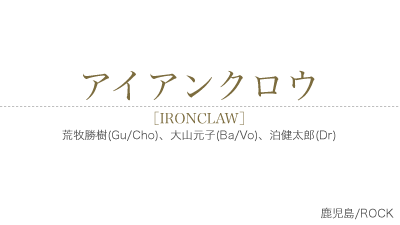 1999年結成。2000年より、鹿児島市内のライブハウスにおいて、ライブ活動を開始。 2001年夏より、鹿児島県外におけるライブ活動を開始。同年よりバンド名を「アイアンクロー」から画数の都合上、「アイアンクロウ」に改名。2002年12月より3回に渡り、自主企画イベント「VSシリーズ」を開催。 鹿児島・福岡・熊本を中心に九州内でライブ活動を行う。 2003年11月15日にアルバム「疼く夜性」発売。同時に企画イベントを行う。 2004年2月1日をもって解散。 |