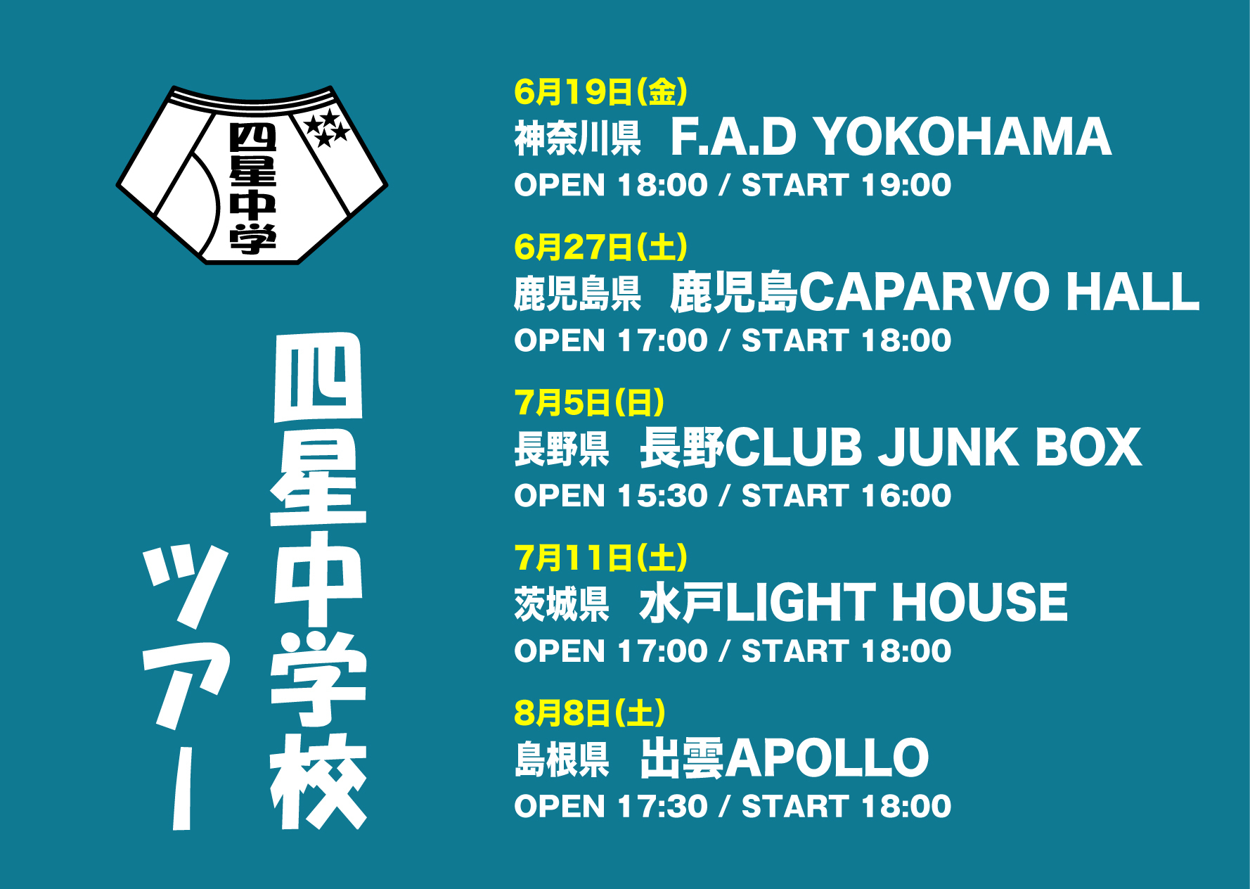 四星球 鹿児島キャパルボ公演決定 2025-11-21 NEWS LIVE 2026.6 四星球 2026年上半期ワンマンツアー「四星中学校ツアー」 2026年6月27日(土) CAPARVO HALL OPEN17:00 START18:00 前売り:¥4,200 MORE INFO